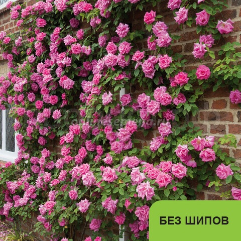 Эта красивая бурбонская роза - одна из самых известных плетистых роз, и это неудивительно: ее побеги практически лишены шипов, а яркие цветки с приятным ароматом делают ее любимицей многих садоводов. Удлиненные бутоны распускаются в полумахровые или махровые, рыхлые чашевидные цветки, 9-10 см в диаметре. Клубнично-розовые лепестки у основания белые, и оттеняются пучком золотых тычинок в центре. Появляются по одному или в небольших кистях (обычно по 3-5 шт.), в огромном количестве. Зацветает очень рано и цветет все лето, практически непрерывно, до поздней осени. Аромат сильный, сладкий. Куст довольно сильнорослый, с гладкими малиновыми стеблями, красным молодым приростом, и матовой зеленой листвой. Можно выращивать как шраб, невысокую плетистую розу, либо пустить по стене